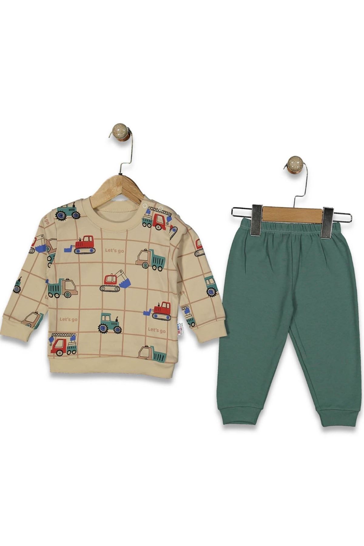 Erkek Bebek Bej Yeşil Traktör Baskılı 2'li Takım