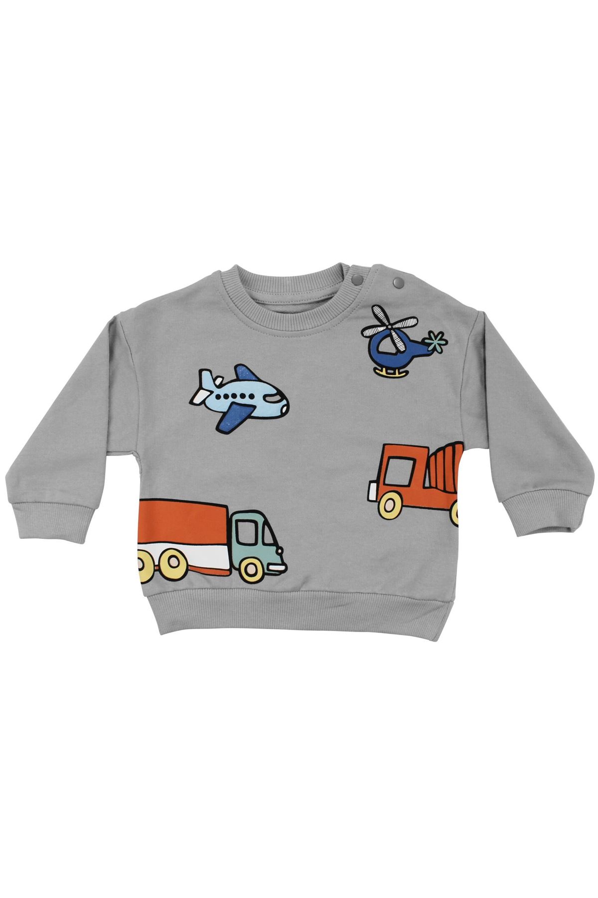 Gri renk zemin üzerinde uçak ve kamyon baskıları – eğlenceli ve sevimli tasarım