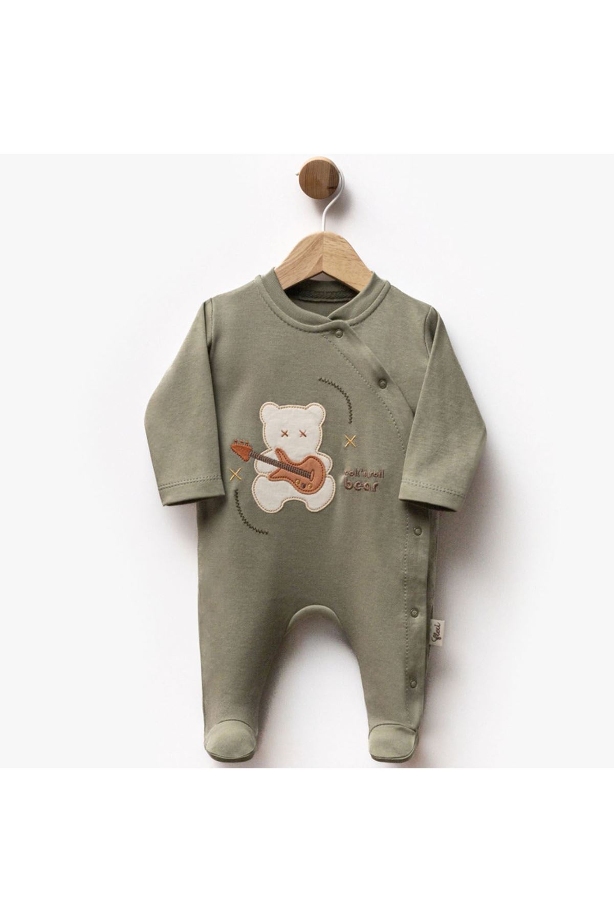 Erkek Bebek Haki Yeşil Gitarlı Ayıcık Desenli Çıtçıtlı Patikli Tulum