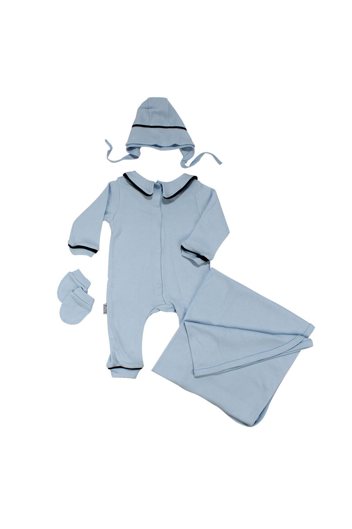 Erkek Bebek Mavi Laci Biyeli Bereli Tulum Battaniye Dört Parça Set 0-3 Ay