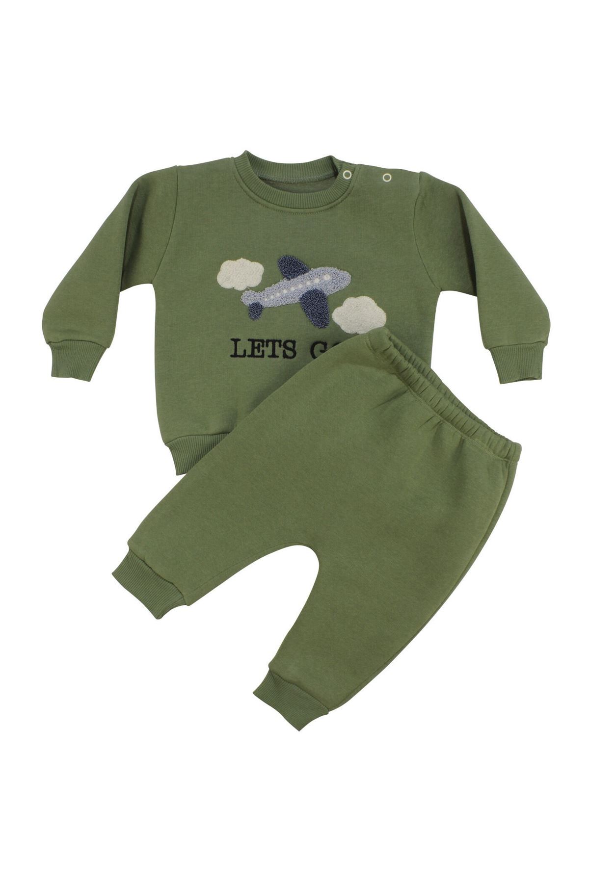 Üst kısmındaki uçak nakışı, takıma eğlenceli ve dikkat çekici bir detay katar. Yeşil renk, modern ve canlı bir görünüm sağlar. Alt kısmın rahat kesimi, miniklerin hareketlerini özgürce yapabilmesine olanak tanır.