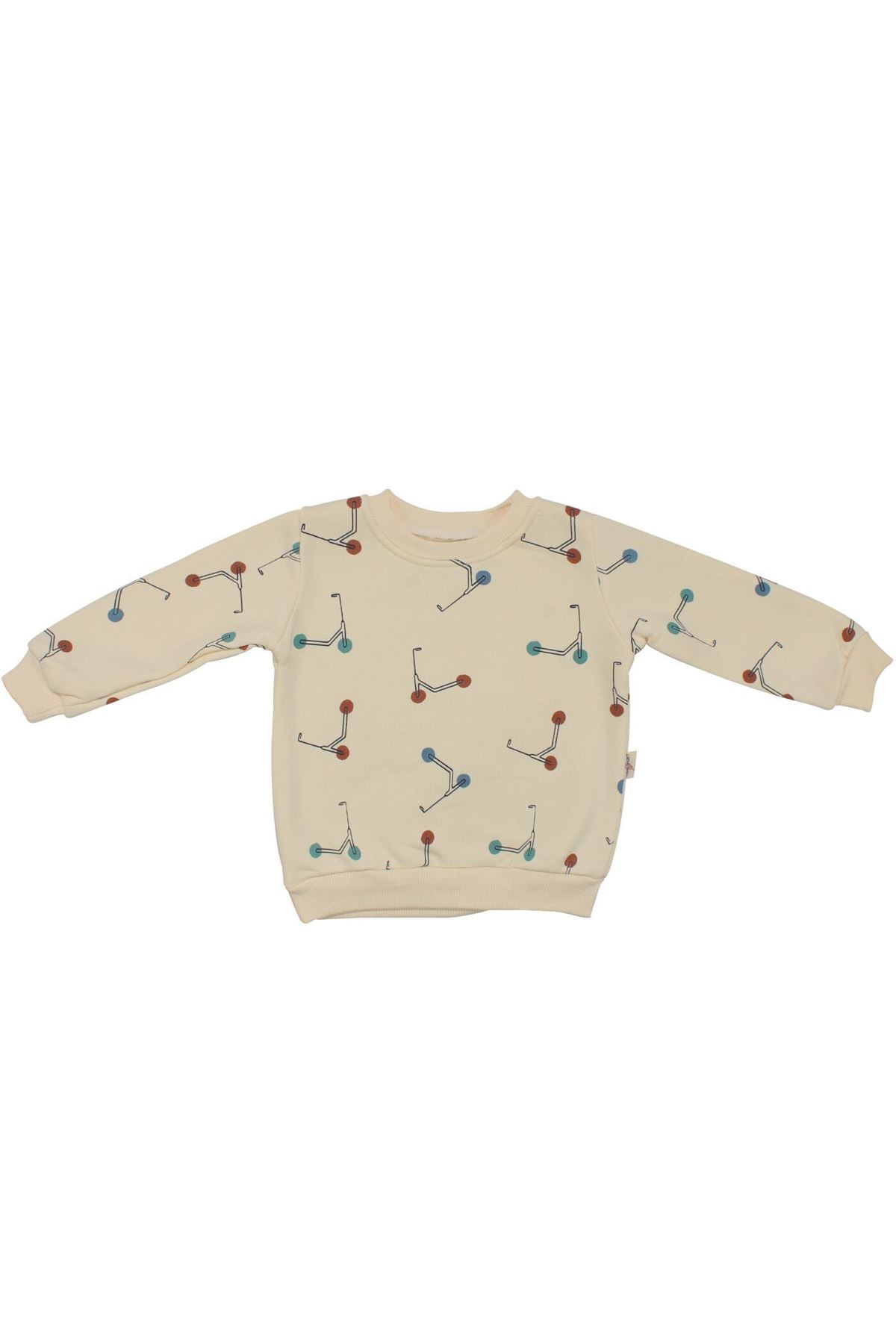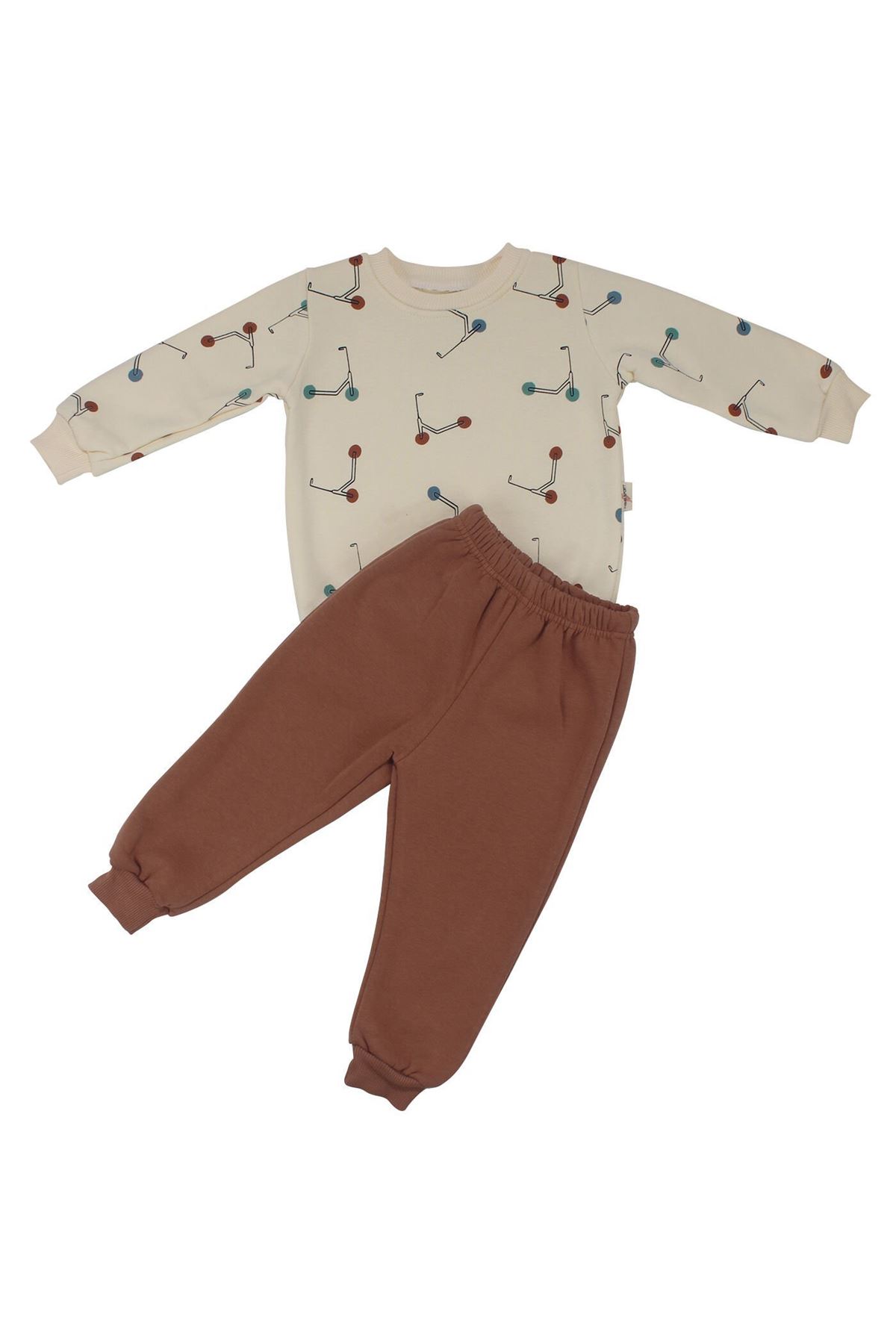 Takım; scooter baskısı bulunan ekru sweatshirt ve uyumlu mavi pantolondan oluşur. Günlük giyimde, okulda veya dışarı gezilerinde rahat ve stil sahibi bir görünüm sağlar.