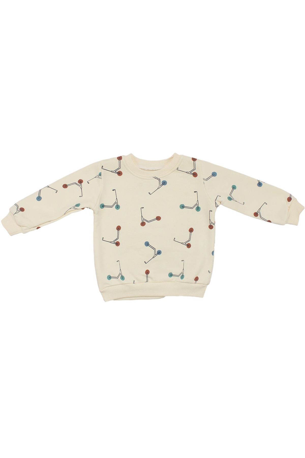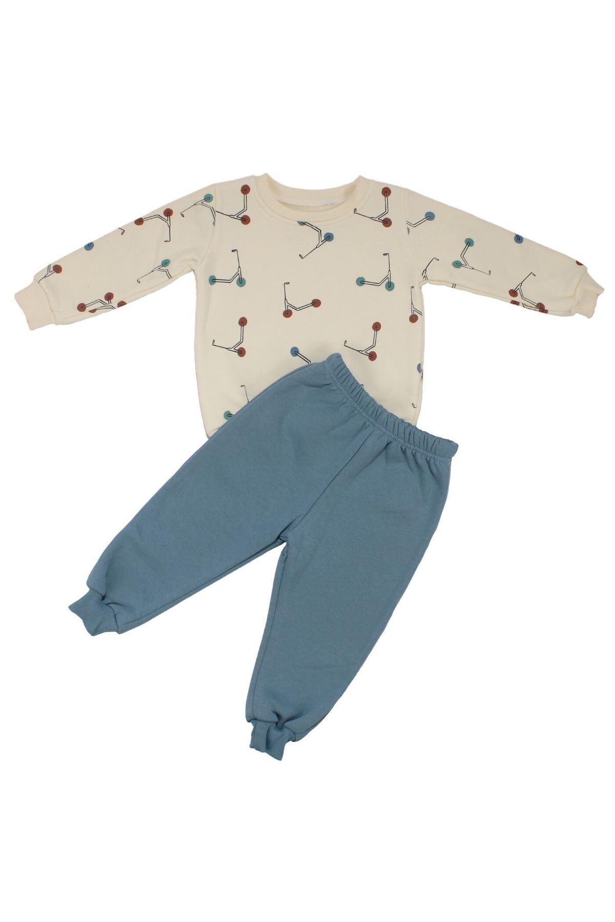 Takım; scooter baskısı bulunan ekru sweatshirt ve uyumlu mavi pantolondan oluşur. Günlük giyimde, okulda veya dışarı gezilerinde rahat ve stil sahibi bir görünüm sağlar.