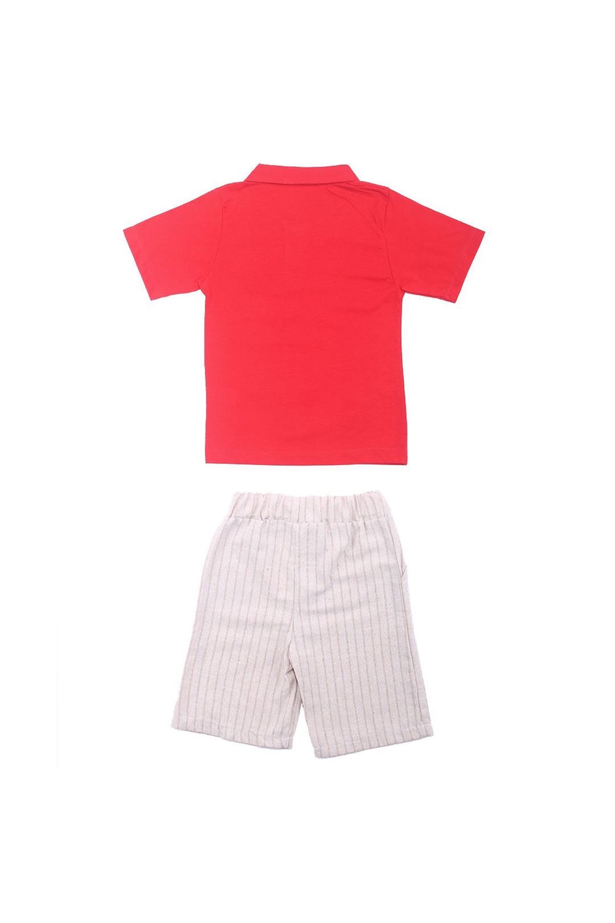 Erkek Çocuk Kırmızı Çapa Dümenli Keten Şortlu 2'li Takım