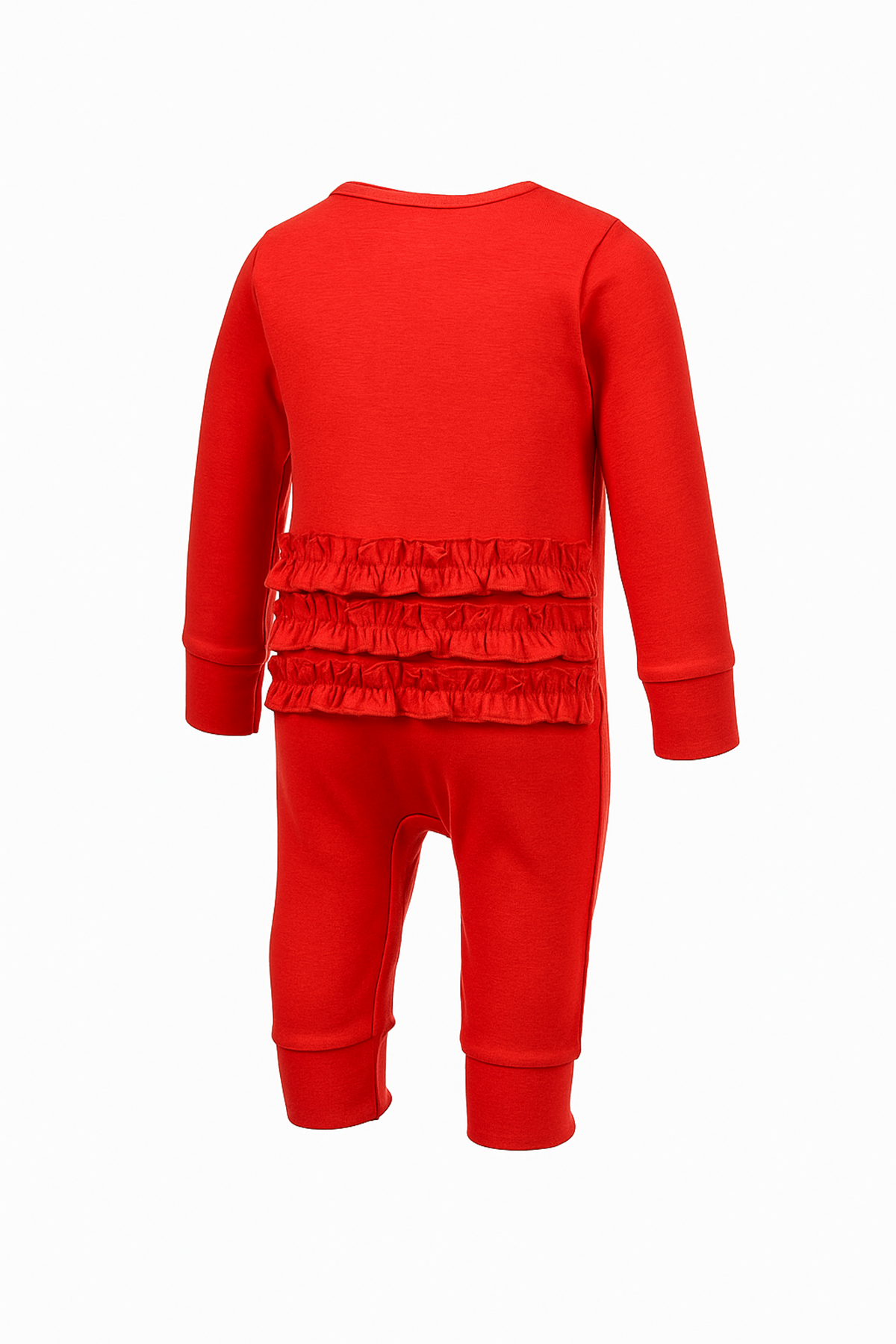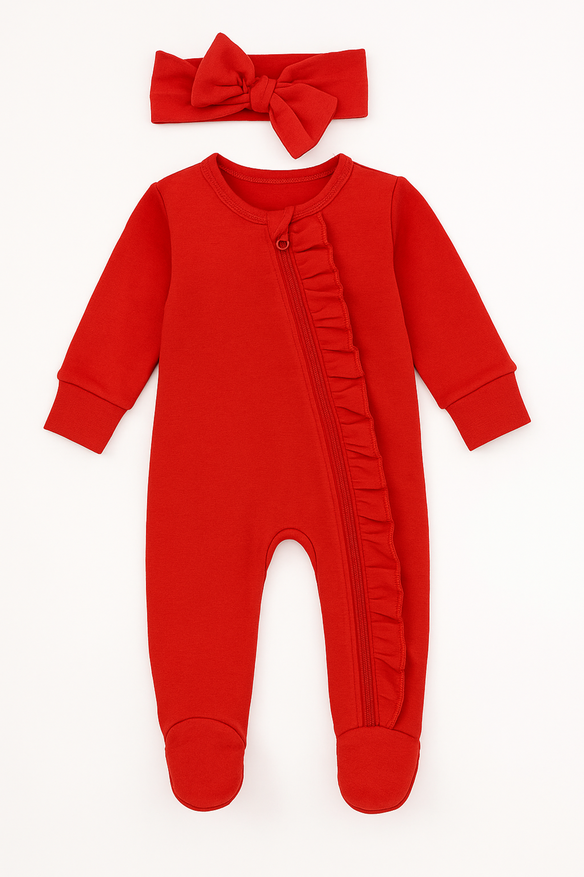 Bebeğinizin narin cildi için özenle üretilen Fırfırlı Bandanalı Bordo Tulum, hem konforlu hem de şık bir seçenektir. Yumuşak %100 pamuk kumaşı, ciltte tahriş yapmaz ve gün boyu rahat kullanım sağlar. Kanserojen içermeyen boyalarla renklendirilmiştir. Fermuarlı ön kısmı, giydirme ve çıkarma işlemini kolaylaştırır. Aynı renkteki fiyonklu bandanası ile kombin tamamlanır.