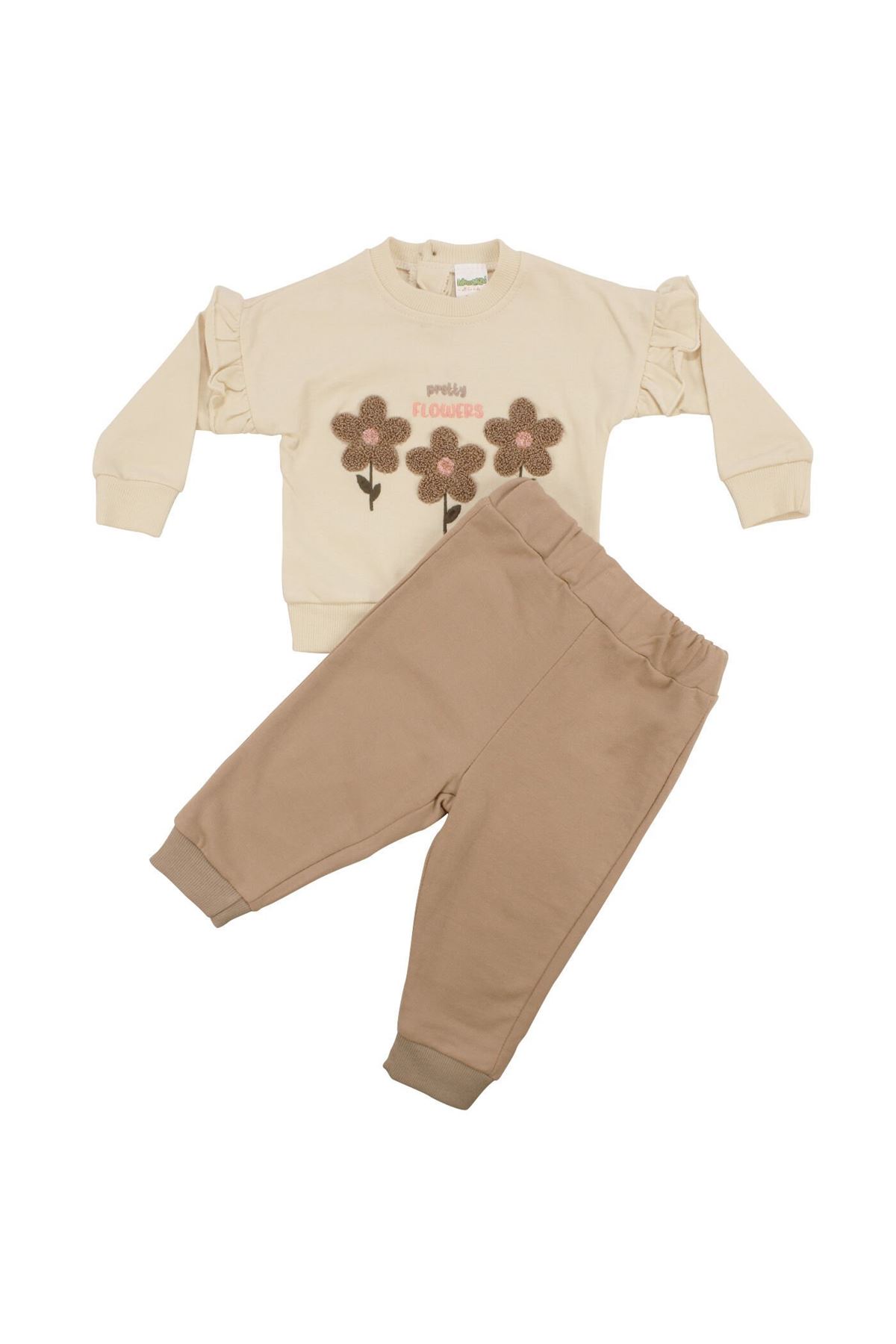 Üst kısmındaki çiçek nakışı, takıma zarif ve dikkat çekici bir detay katar. Ekru ve kahve renk kombinasyonu, doğal ve şık bir görünüm sunar.