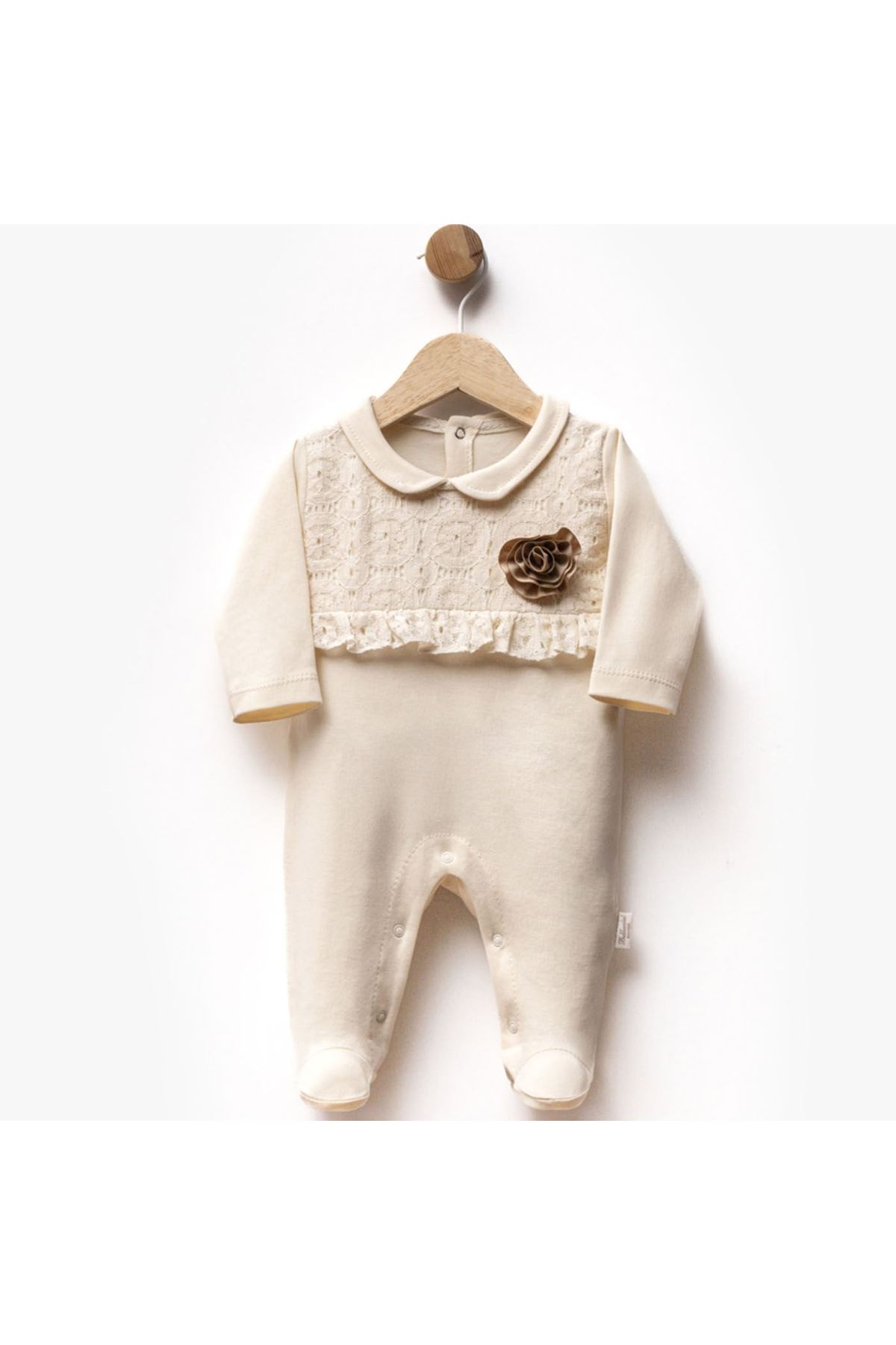Kız Bebek Ekru Kahve Gül Armalı Dantelli Patikli Tulum