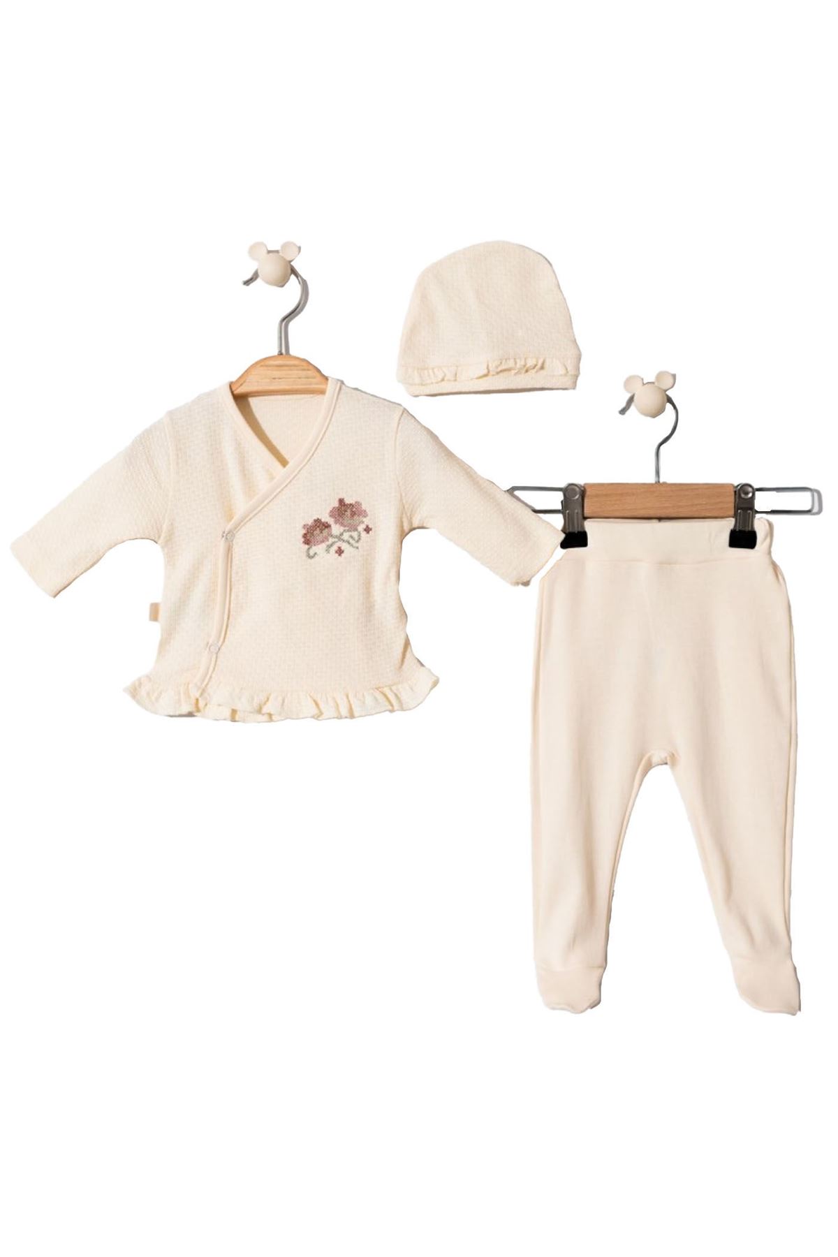 Kız Bebek Ekru Kanaviçe Çicek Nakışlı Fırfırlı Bereli Patikli 3'lü Takım