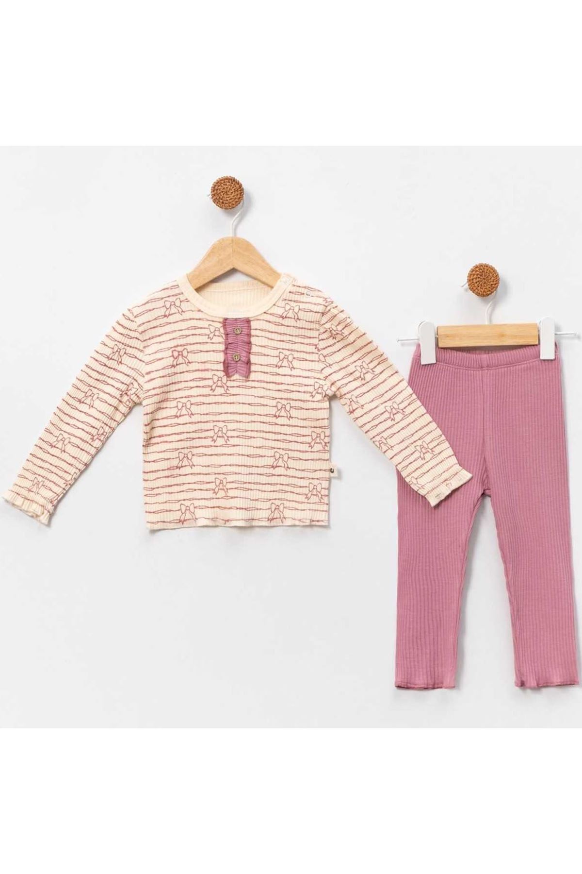 Kız Bebek Ekru Mor Fiyonklu Desenli 2'li Takım