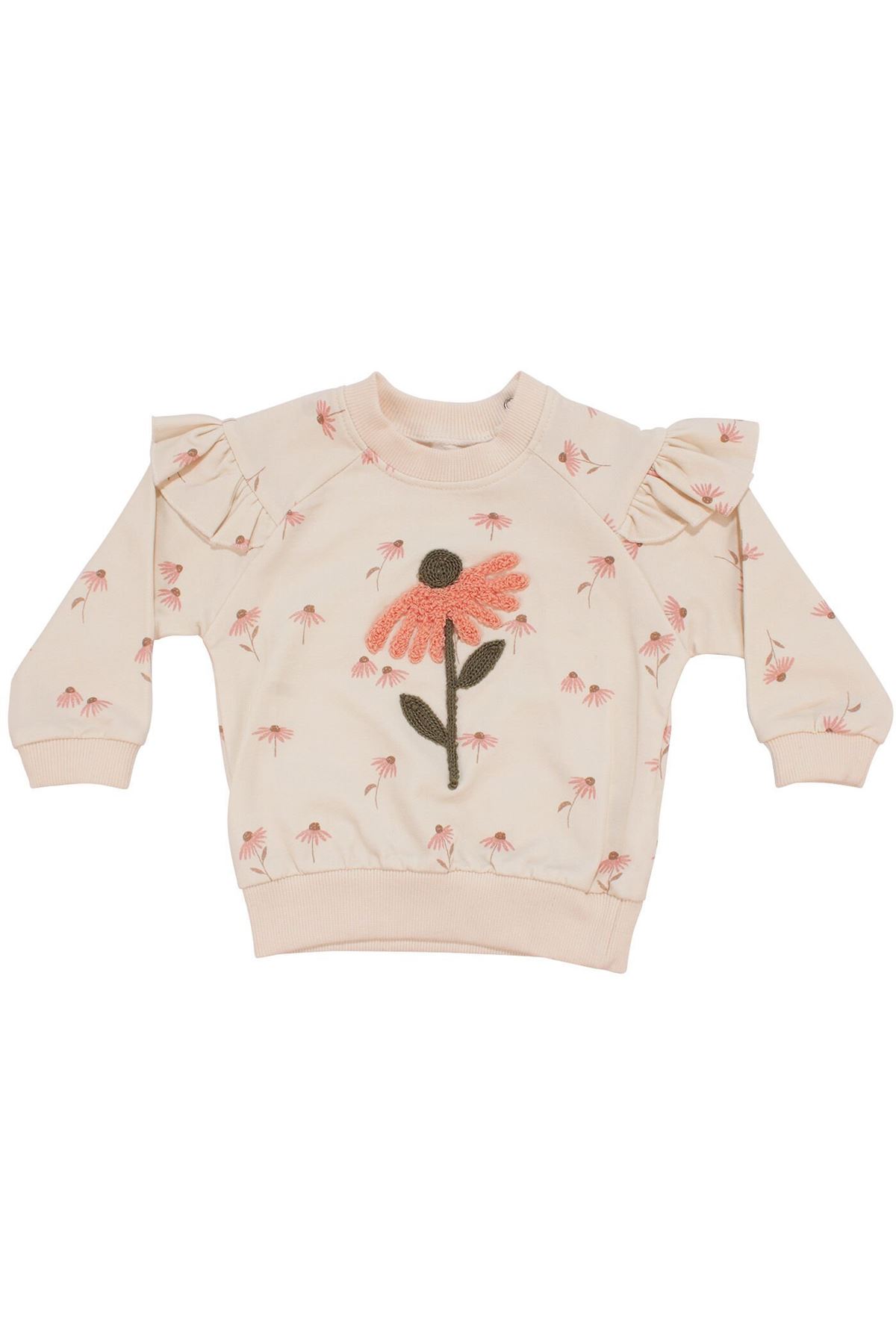 Üst kısmındaki papatya nakışı ve fırfırlı kollar, takıma zarif ve tatlı bir detay ekler. Ekru ve pembe renk kombinasyonu, miniklere neşeli ve şık bir görünüm sunar.