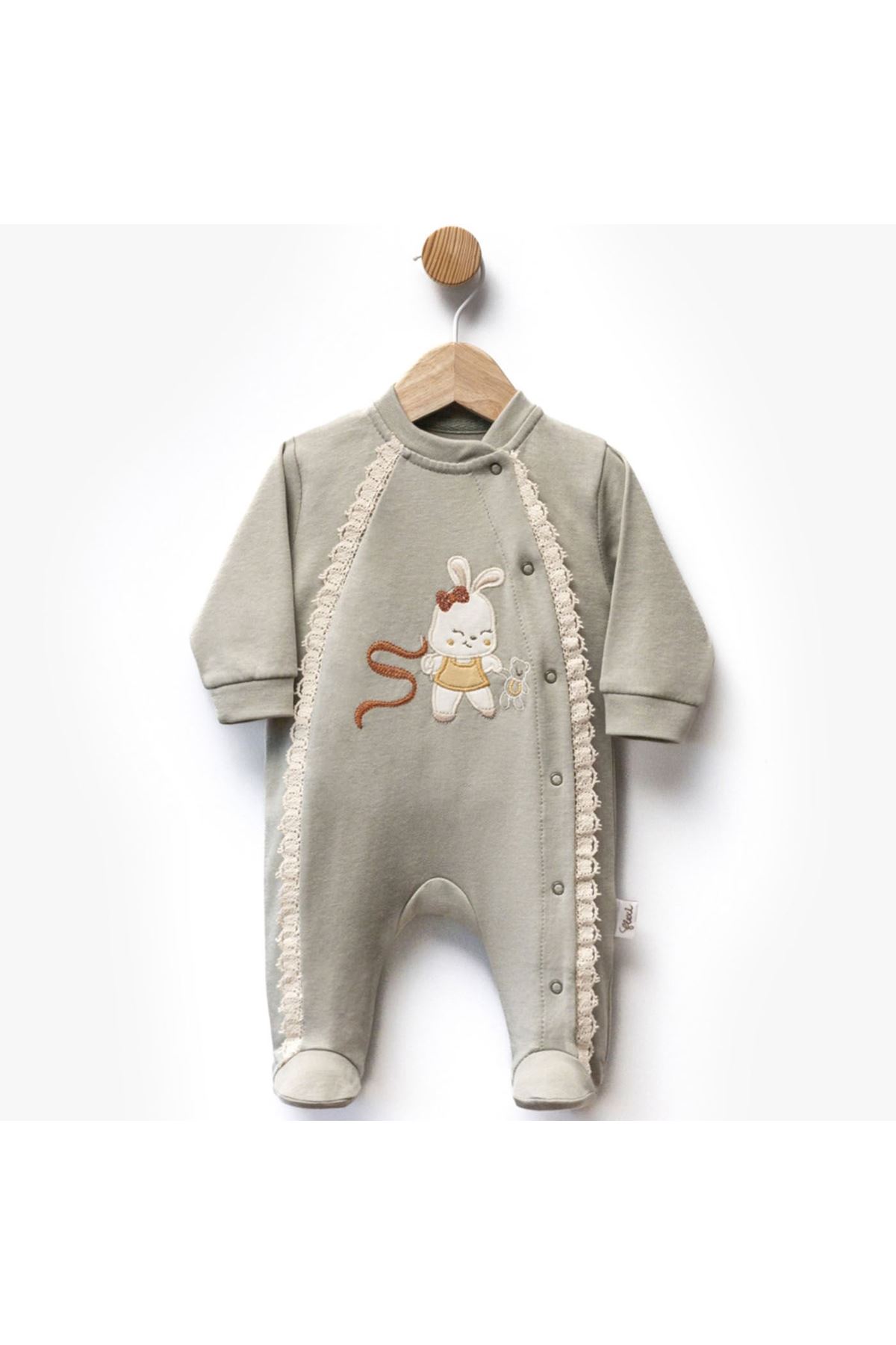 Kız Bebek Haki Yeşil Fistolu Tavşanlı Desenli Çıtçıtlı Patikli Tulum