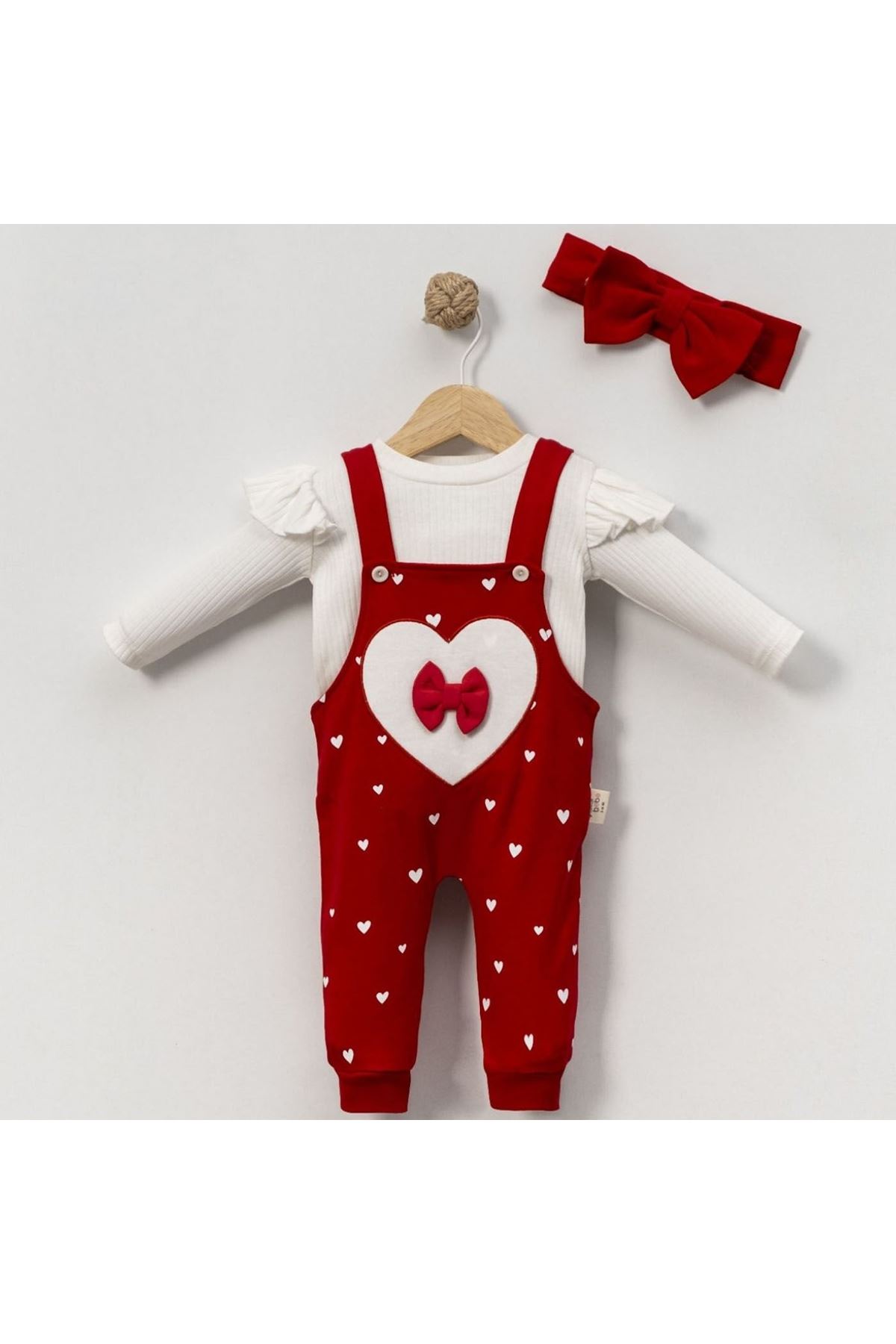 Kız Bebek Kırmızı Kalpli Fiyonklu Bandanalı Salopet Takım