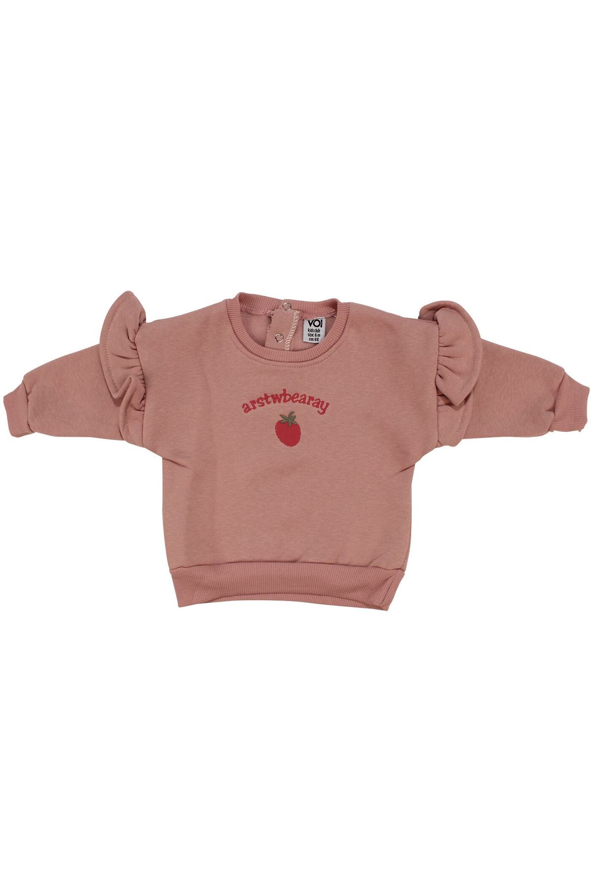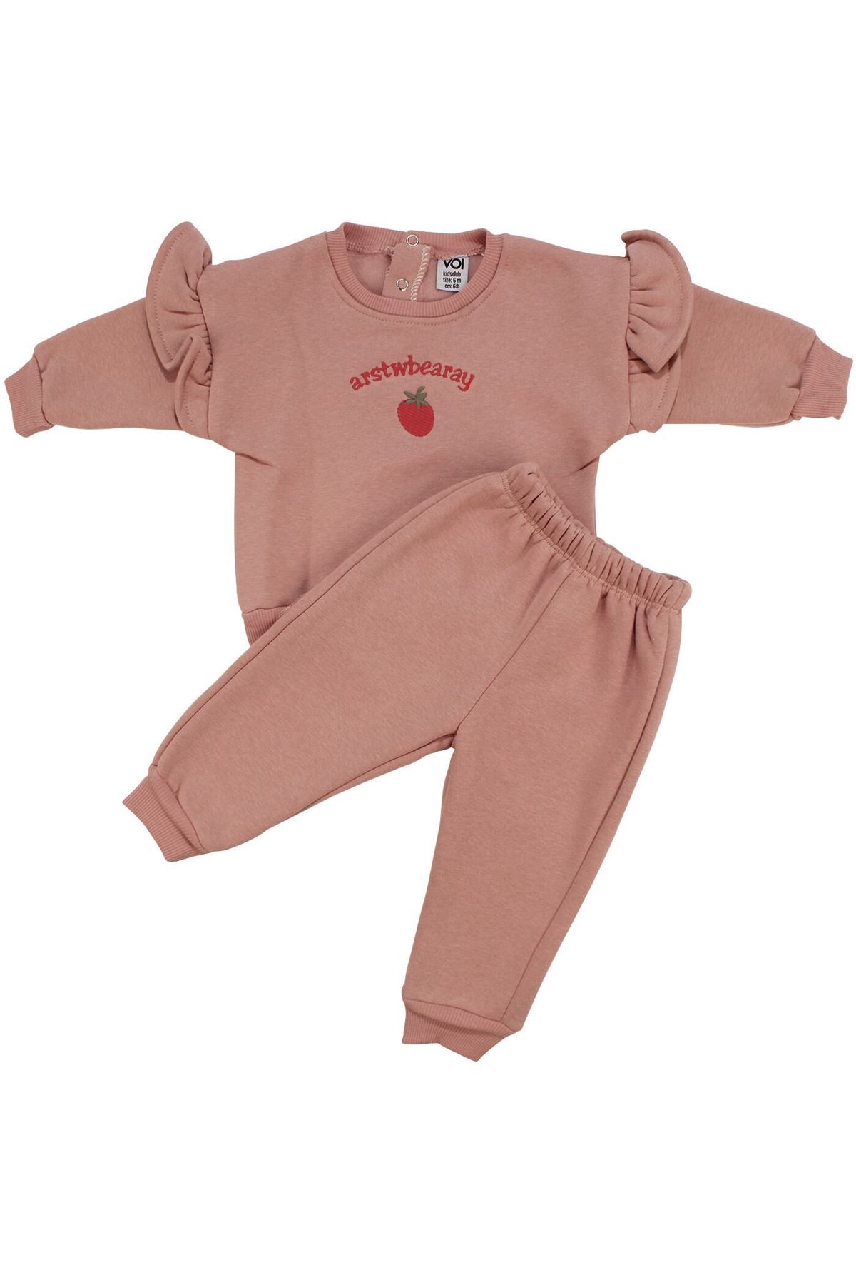 Üst kısmındaki sevimli çilek nakışı, takıma tatlı ve dikkat çekici bir detay katar. Canlı pembe rengi ile hem neşeli hem de zarif bir görünüm sağlar.