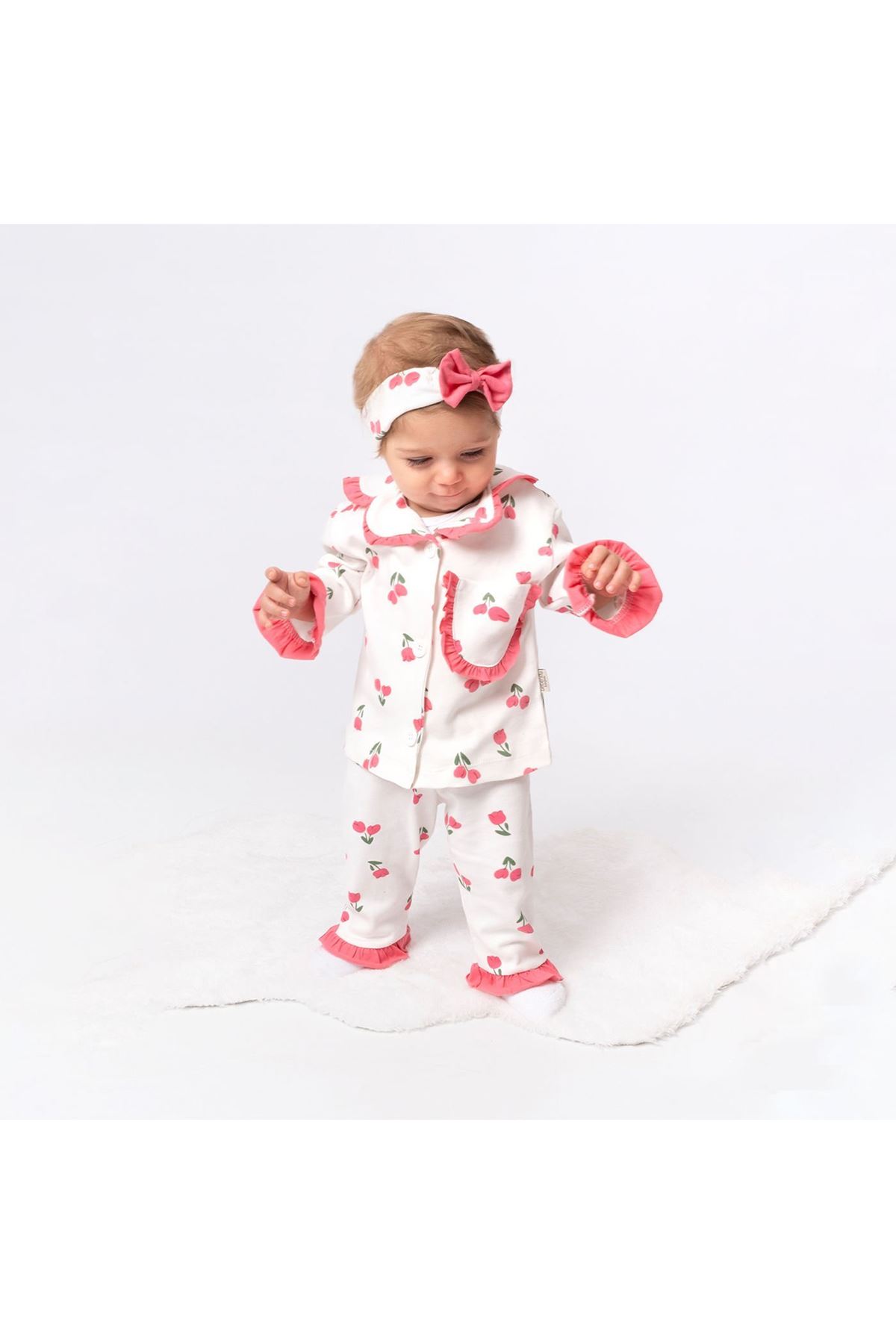 Kız Çocuk Ekru Pembe Lale Desenli Fırfırlı Bandanalı Pijama Takımı
