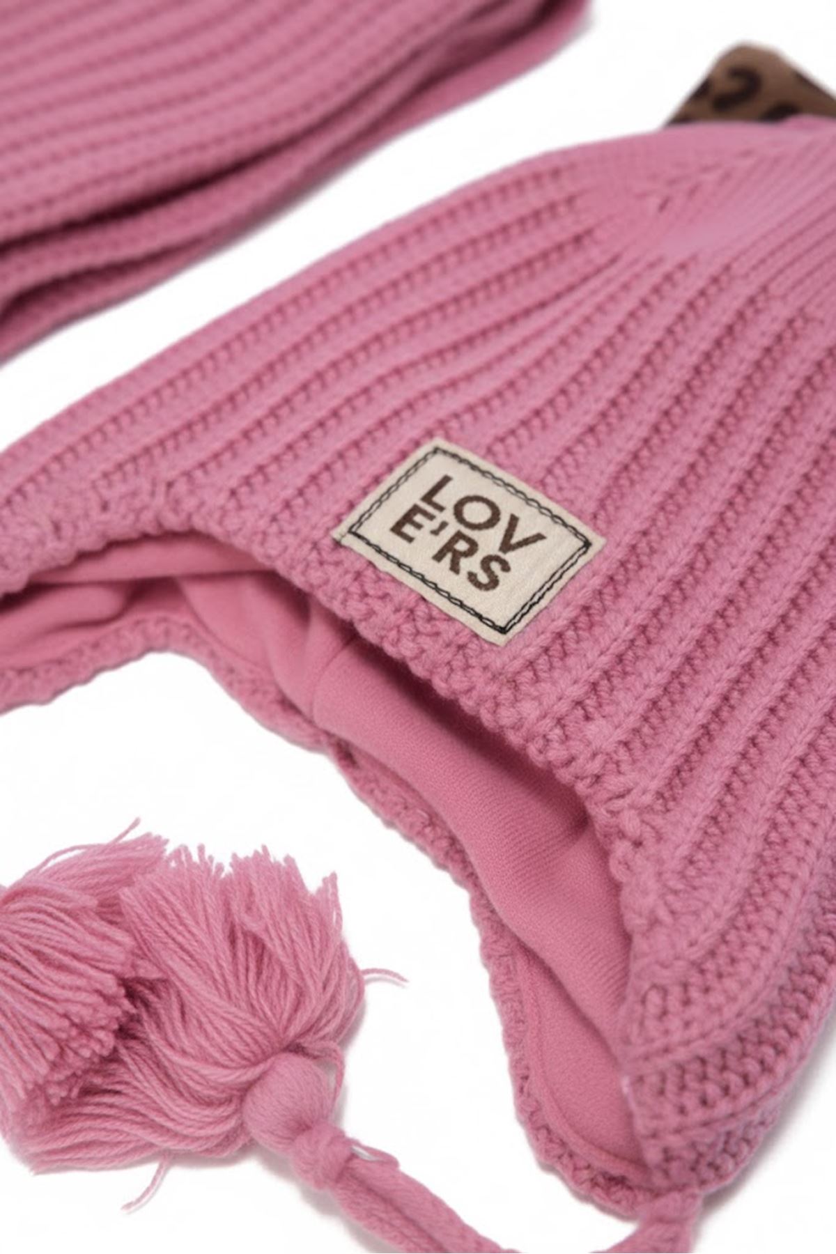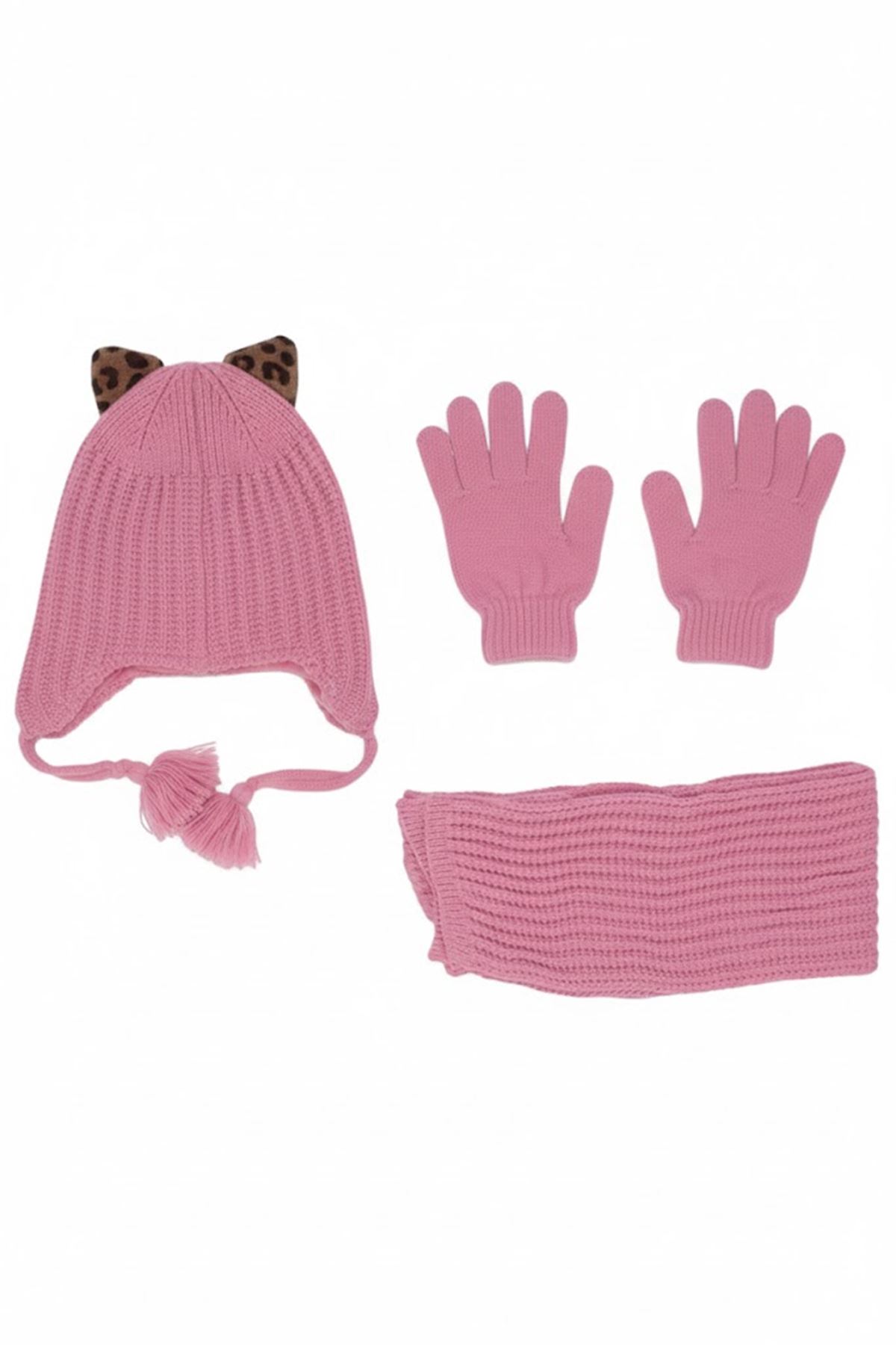 Kız Çocuk Pembe Leopar Kulaklı Lovers Yazılı Atkı Bere Takımı