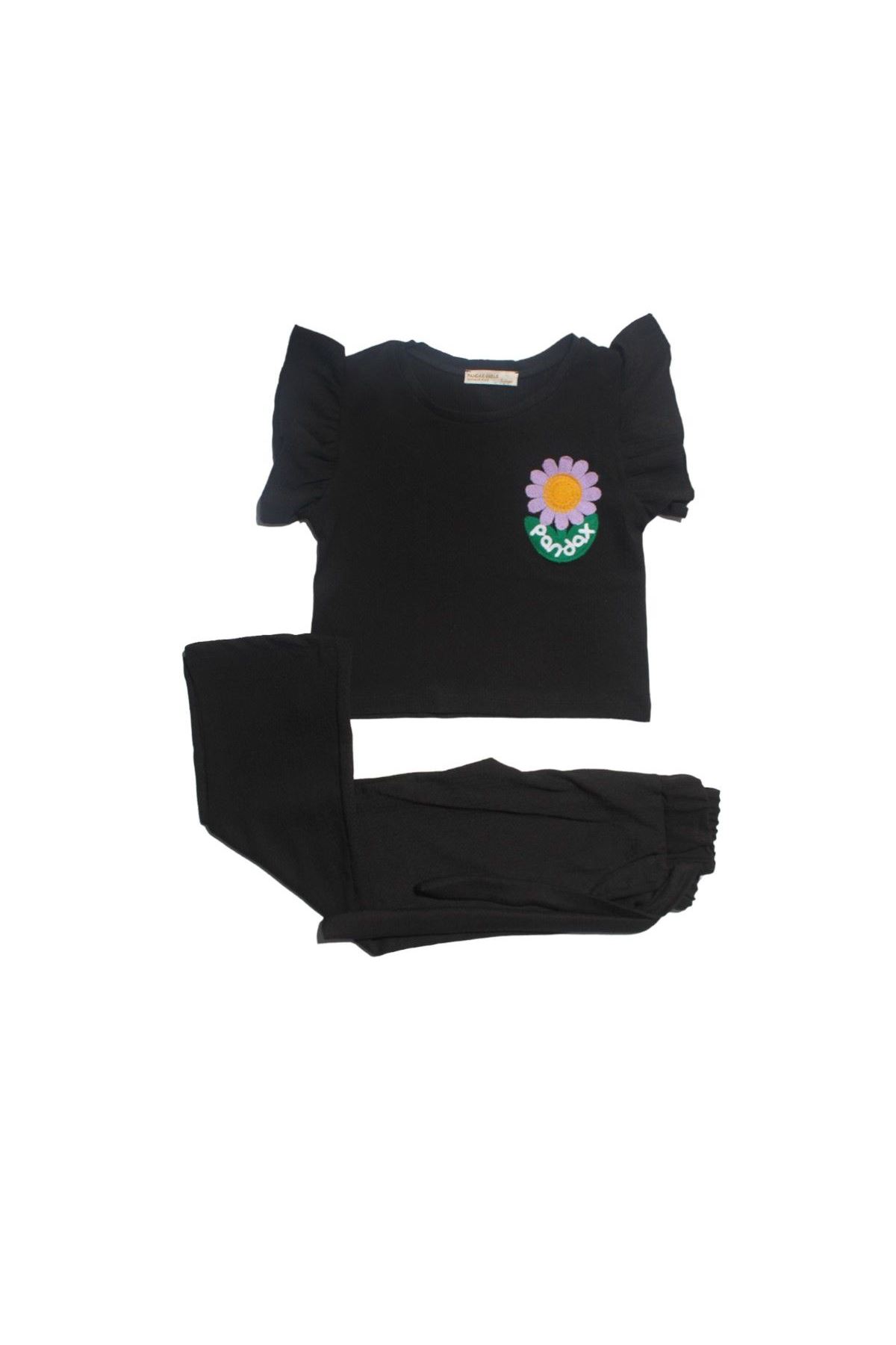 Kız Çocuk Siyah Lila Papatya Nakışlı Bürümcük Pantolonlu 2'Li Takım
