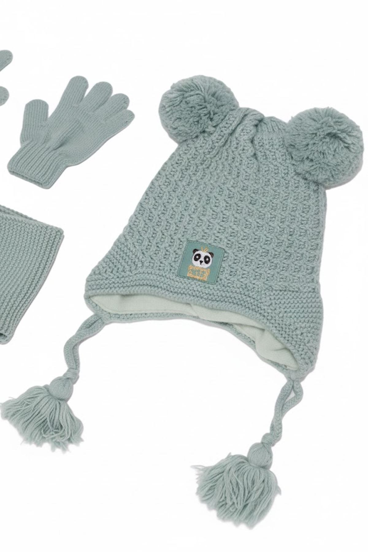Kız Çocuk Yeşil Panda Armalı Triko Atkı Bere Takımı