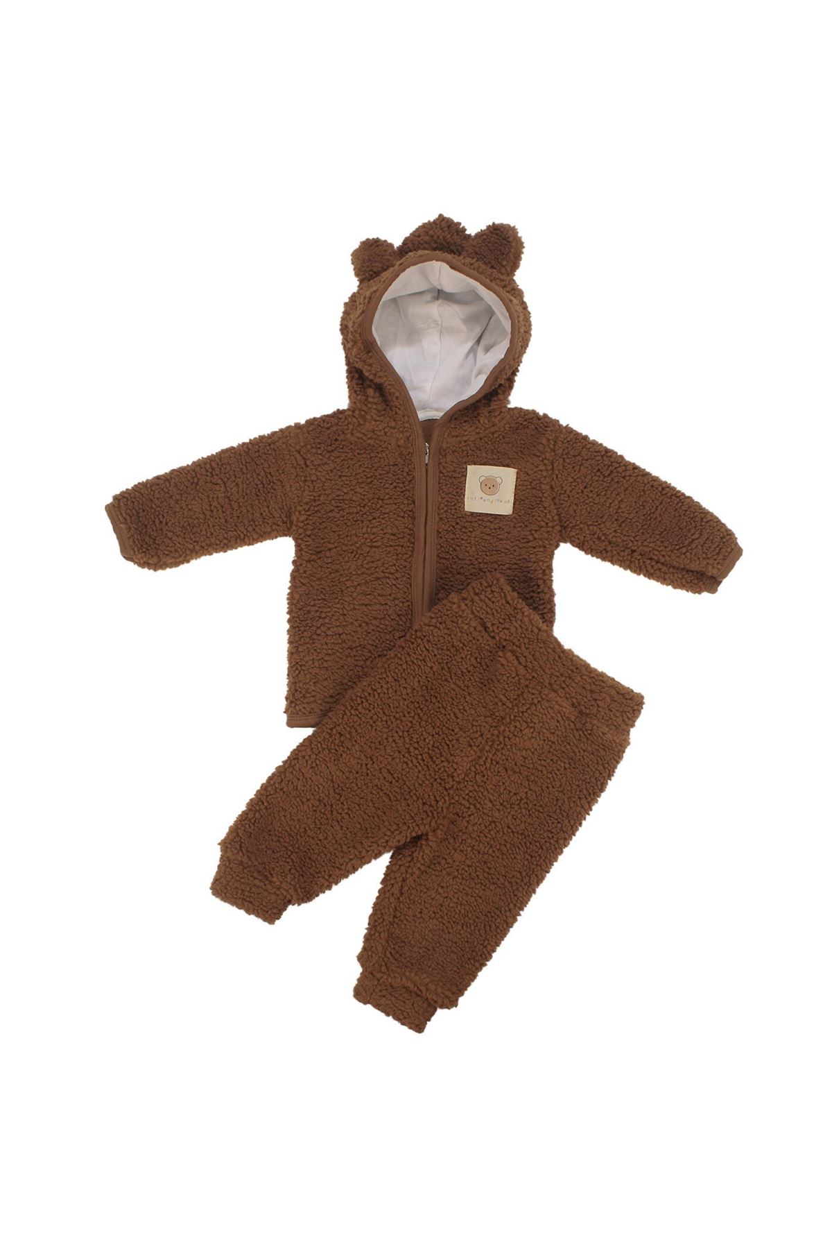 Uyumlu alt parçasıyla birlikte gelen bu ikili takım, günlük kullanım için mükemmel bir konfor sunar. Kahve rengiyle hem kız hem erkek bebekler için uygundur.